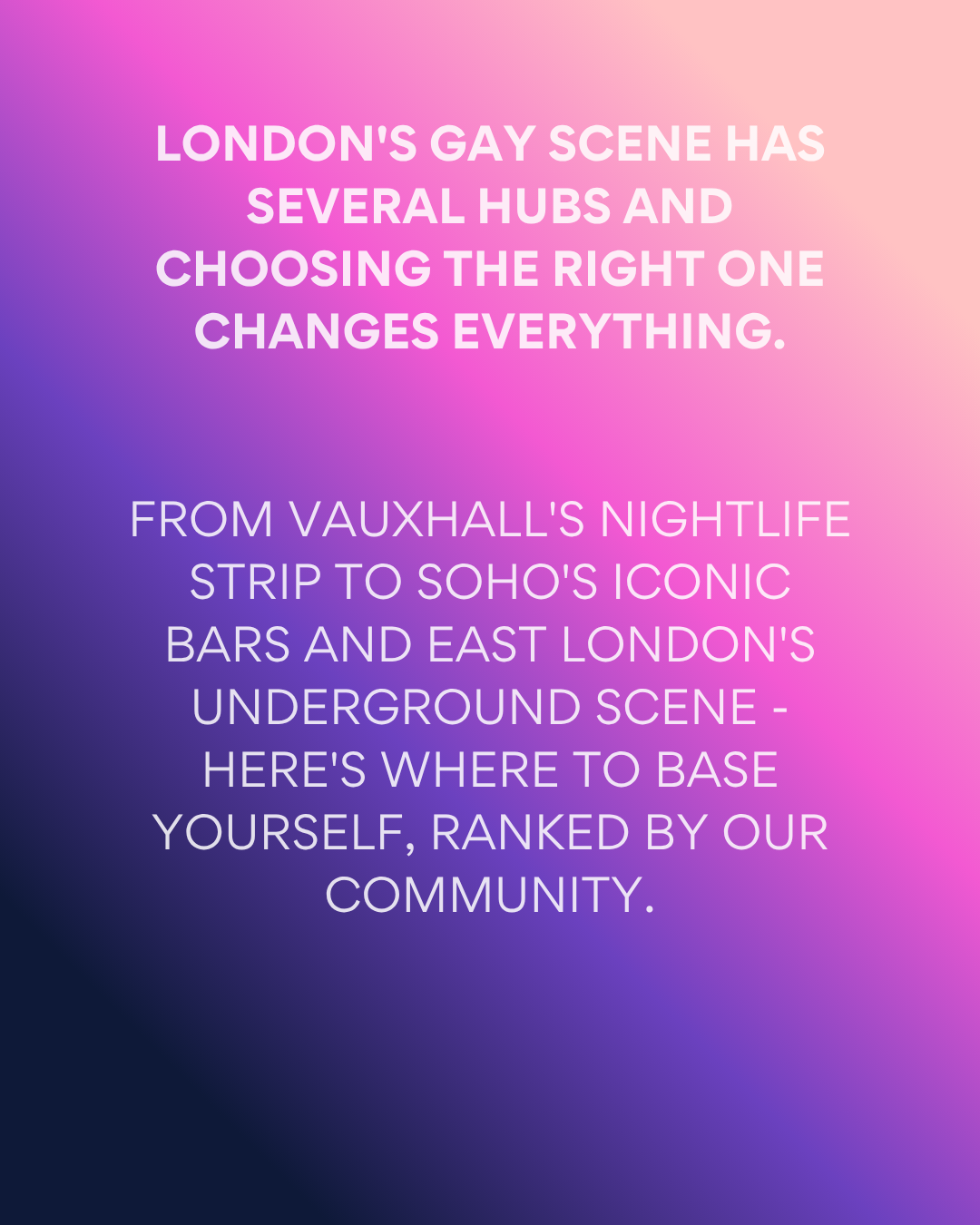 London's gay scene has several hubs and choosing the right one changes everything. Stay in the wrong part of town and you'll spend half your trip in an Uber. Get it right and the bars, clubs, restaurants, and everything in between are on your doorstep. We asked our community of gay travellers to rank London's best neighbourhoods. Here's what they said.