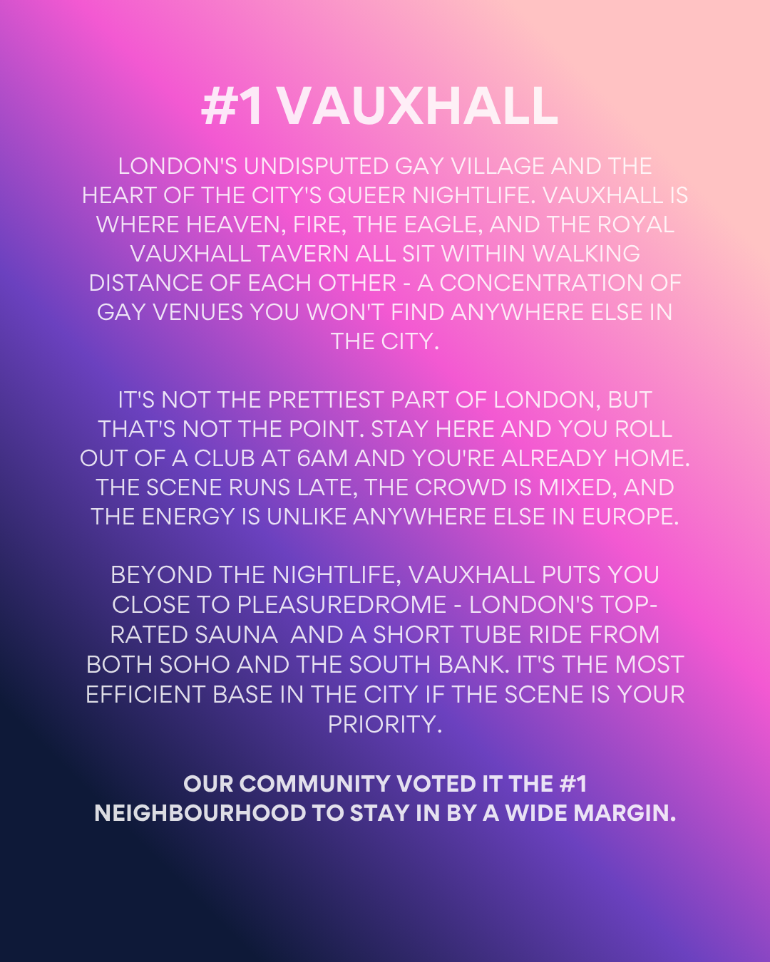 Our community voted Vauxhall the number one neighbourhood to stay in by a wide margin. If the scene is your priority, there is no better base in London.