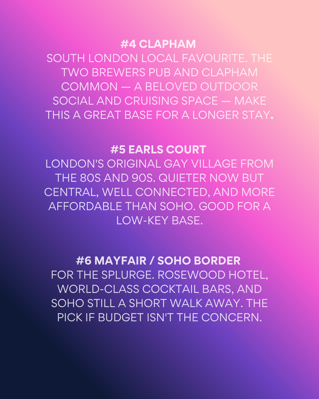 London doesn't have one gay neighbourhood — it has several, each with a distinct character and a different kind of trip attached to it. Vauxhall for the scene. Soho for the classic experience. Hackney for the alternative. Clapham for the local. Earls Court for the value. Mayfair for the splurge.
