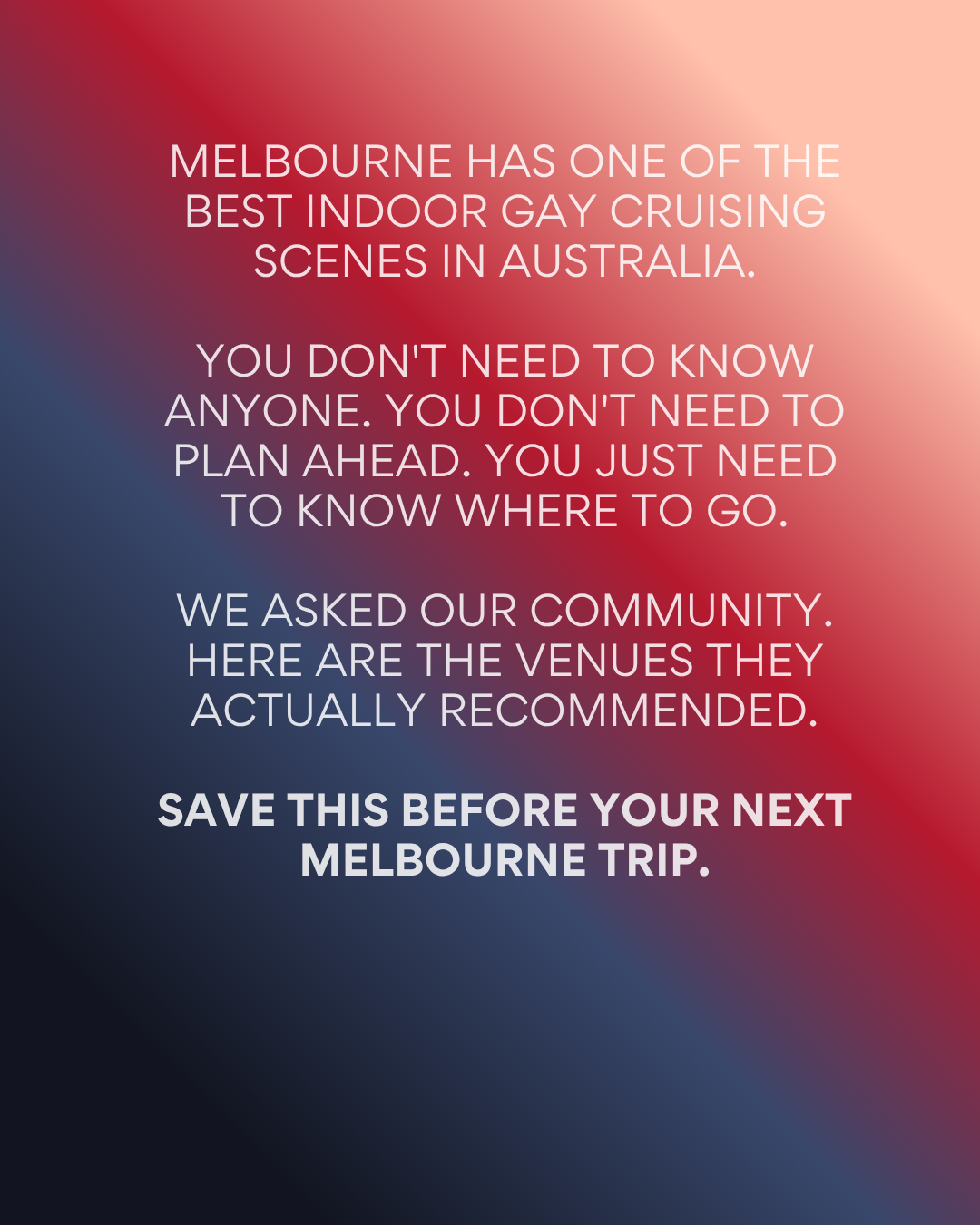 Melbourne has one of the best indoor gay cruising scenes in Australia. The venues are well established, the crowds are consistent, and the city has a long history of supporting spaces where gay men can socialise, cruise, and connect without judgment.