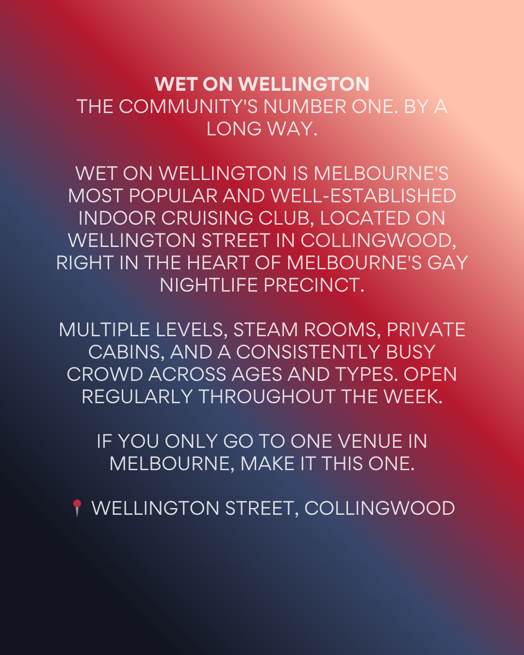 Wet on Wellington on Wellington Street in Collingwood is Melbourne's most recommended gay sauna and cruising venue according to our community survey. It received significantly more recommendations than any other venue in the city.