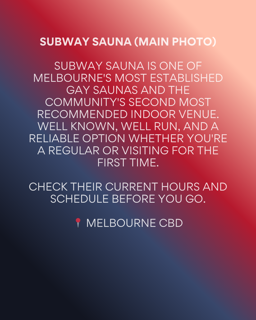 Subway Sauna is Melbourne's second most recommended gay sauna and one of the city's most established indoor cruising venues. It appeared consistently in our community survey and has a strong reputation among both locals and visitors to Melbourne.