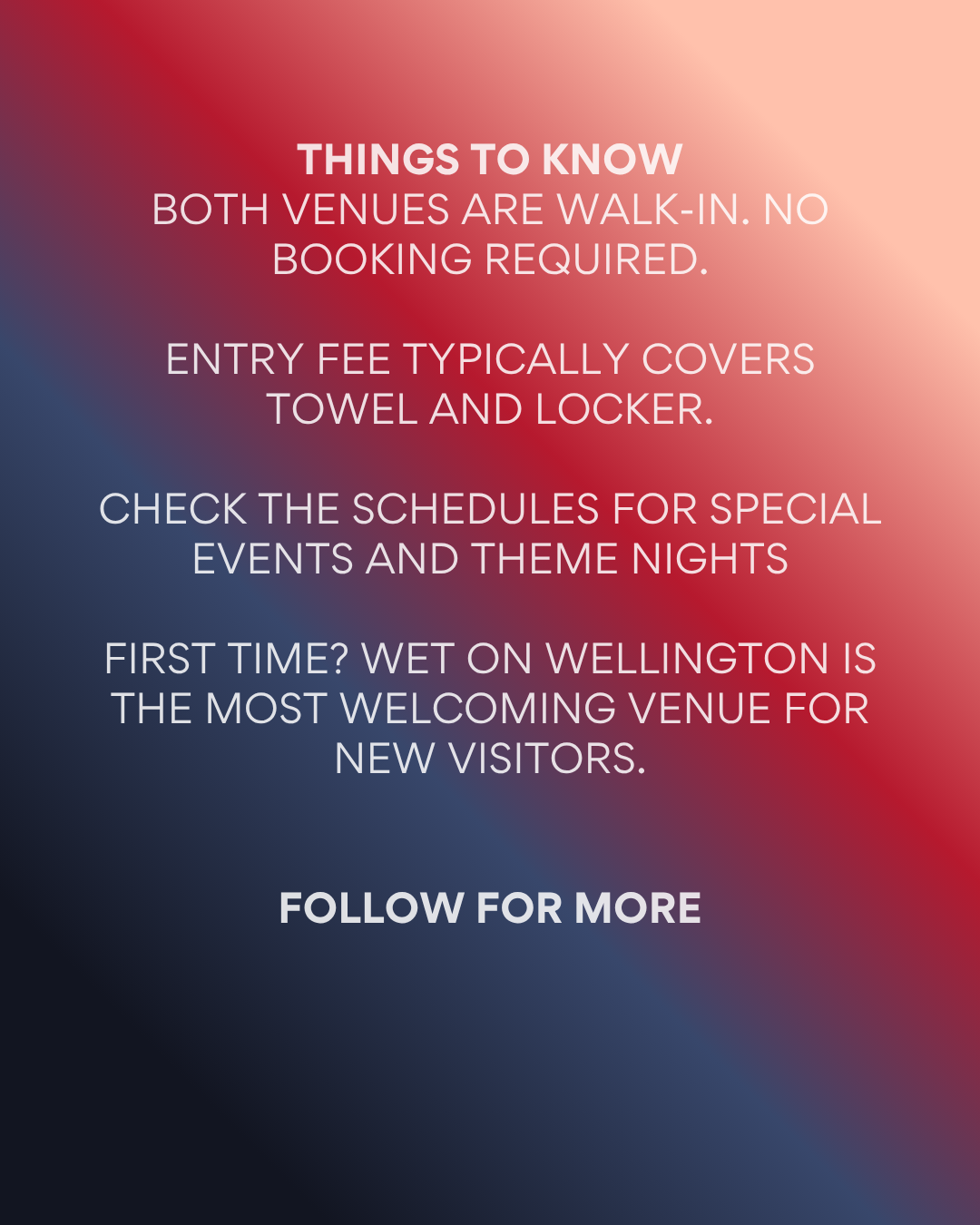 Both Wet on Wellington and Subway Sauna are walk-in venues. You don't need to book in advance or know anyone to visit. Simply show up, pay the entry fee at the door, and you'll be given a towel and locker as part of your admission.