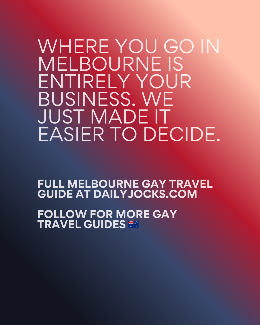 Looking for more Melbourne gay travel content? Visit dailyjocks.com for the full DailyJocks Local guide to Melbourne, covering the best bars, clubs, saunas, beaches, neighbourhoods, and experiences for gay travellers.