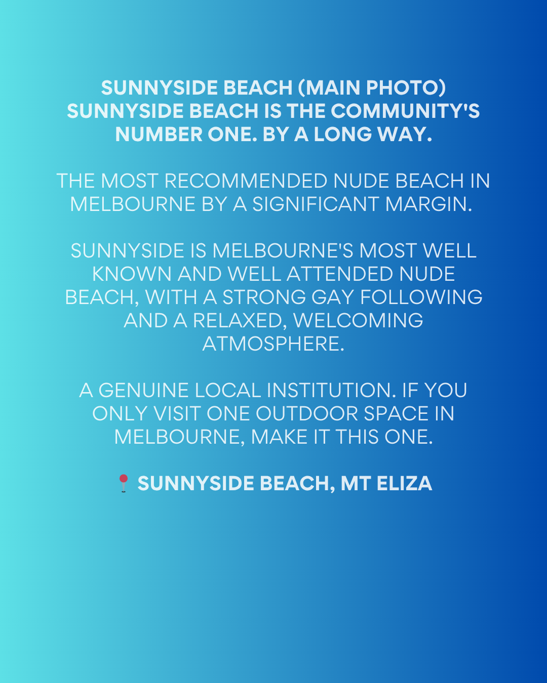 Sunnyside Beach is Melbourne's most recommended nude beach by a clear margin. In our community survey it received more mentions than any other outdoor space in Victoria, and its reputation among Melbourne's gay community is well established.
