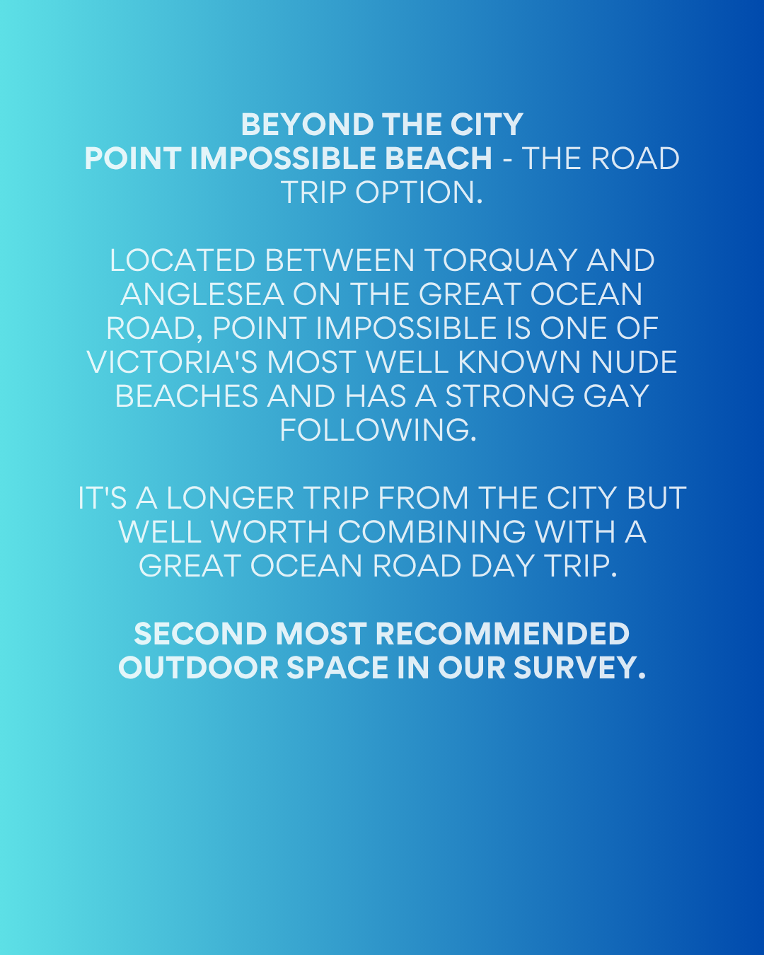 Point Impossible Beach is Victoria's most well known nude beach outside of Melbourne and the second most recommended outdoor space in our community survey. Located between Torquay and Anglesea on the Great Ocean Road, it sits roughly 90 minutes from Melbourne's CBD and has a strong and well established gay following.