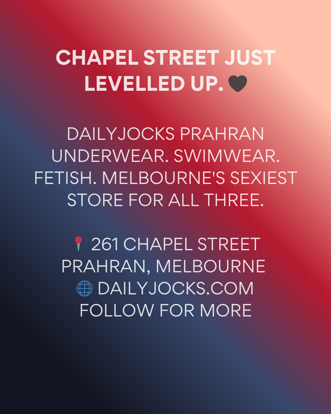Prahran and Chapel Street have changed a lot over the years. The strip has evolved, gentrified, and shifted - but DailyJocks planting its flag back on Chapel Street is a statement. Melbourne's sexiest store is back in one of the city's most iconic shopping precincts, and it's not going anywhere.
