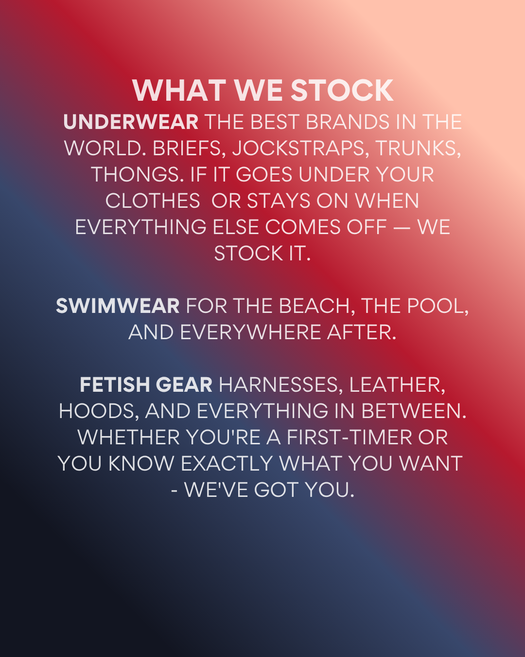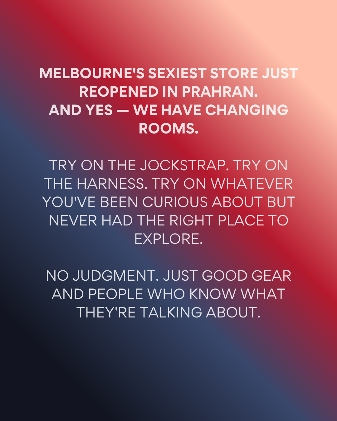 For returning customers, the reopening brings an updated store, a refreshed range, and the same experience you've always come for. The best underwear brands in the world, a swimwear range worth exploring, and a fetish selection that goes further than anywhere else in Melbourne.