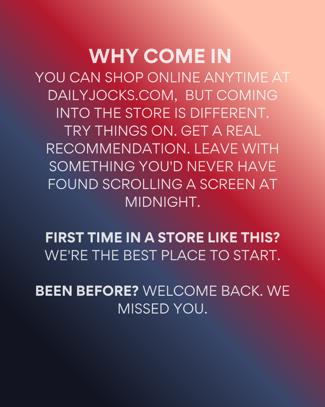 You can shop online at dailyjocks.com anytime, and thousands of people do. But coming into the Prahran store is a different experience entirely.